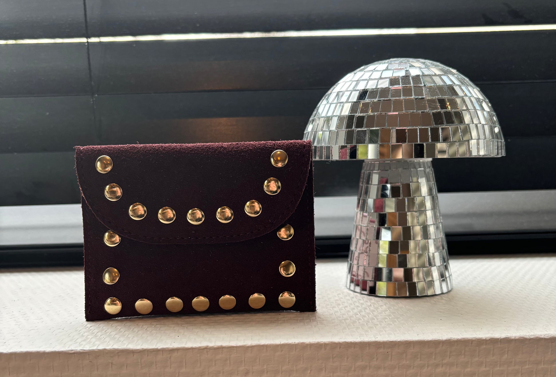 Craquez pour ce porte-monnaie Stella en daim bordeaux, un accessoire incontournable pour vos sorties. Ses clous dorés apportent une touche d'élégance et de sophistication.