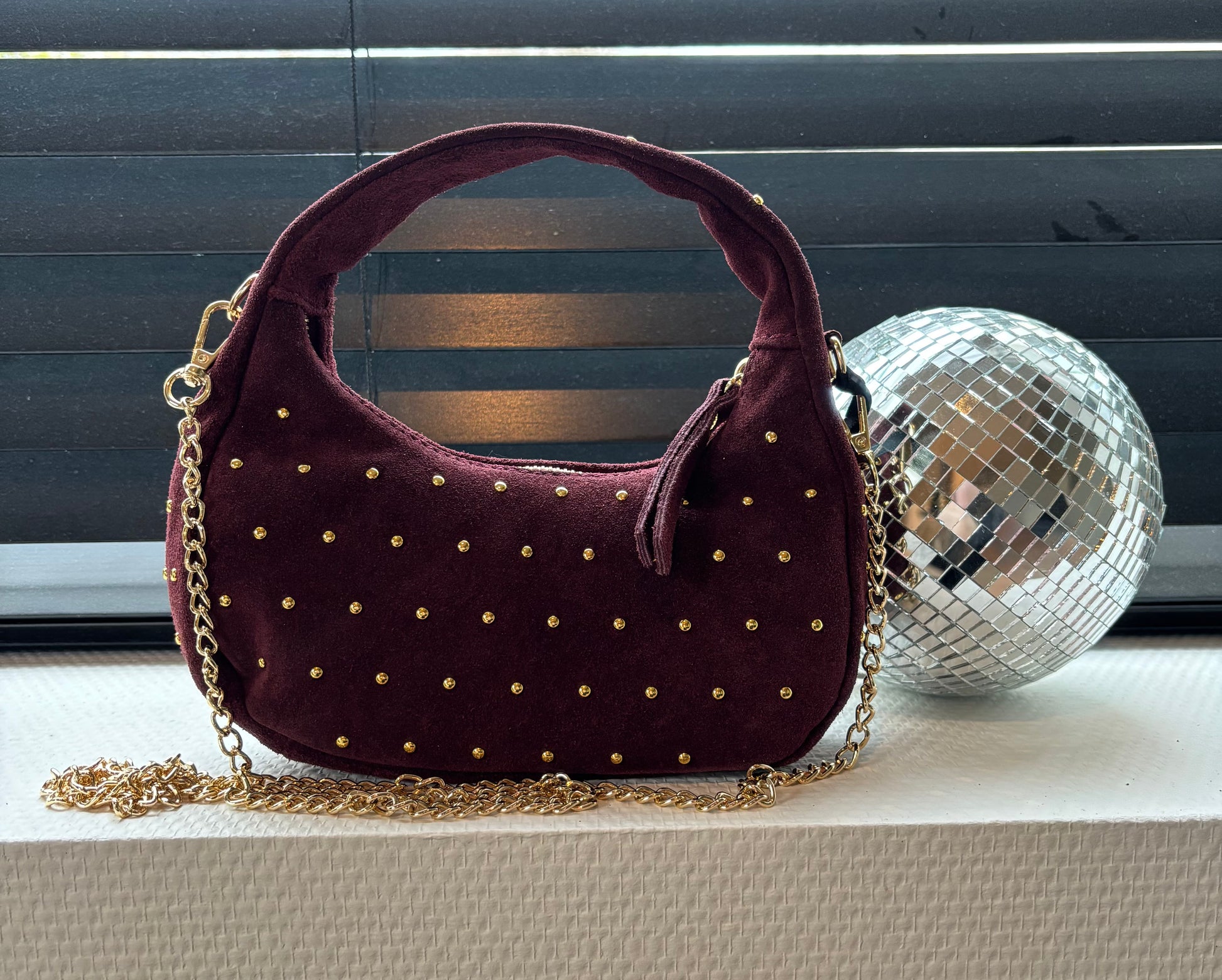 Découvrez le Sac Nova, un accessoire incontournable alliant élégance et polyvalence. Confectionné en daim bordeaux doux et raffiné, il se pare de clous dorés qui ajoutent une touche d'éclat subtil.