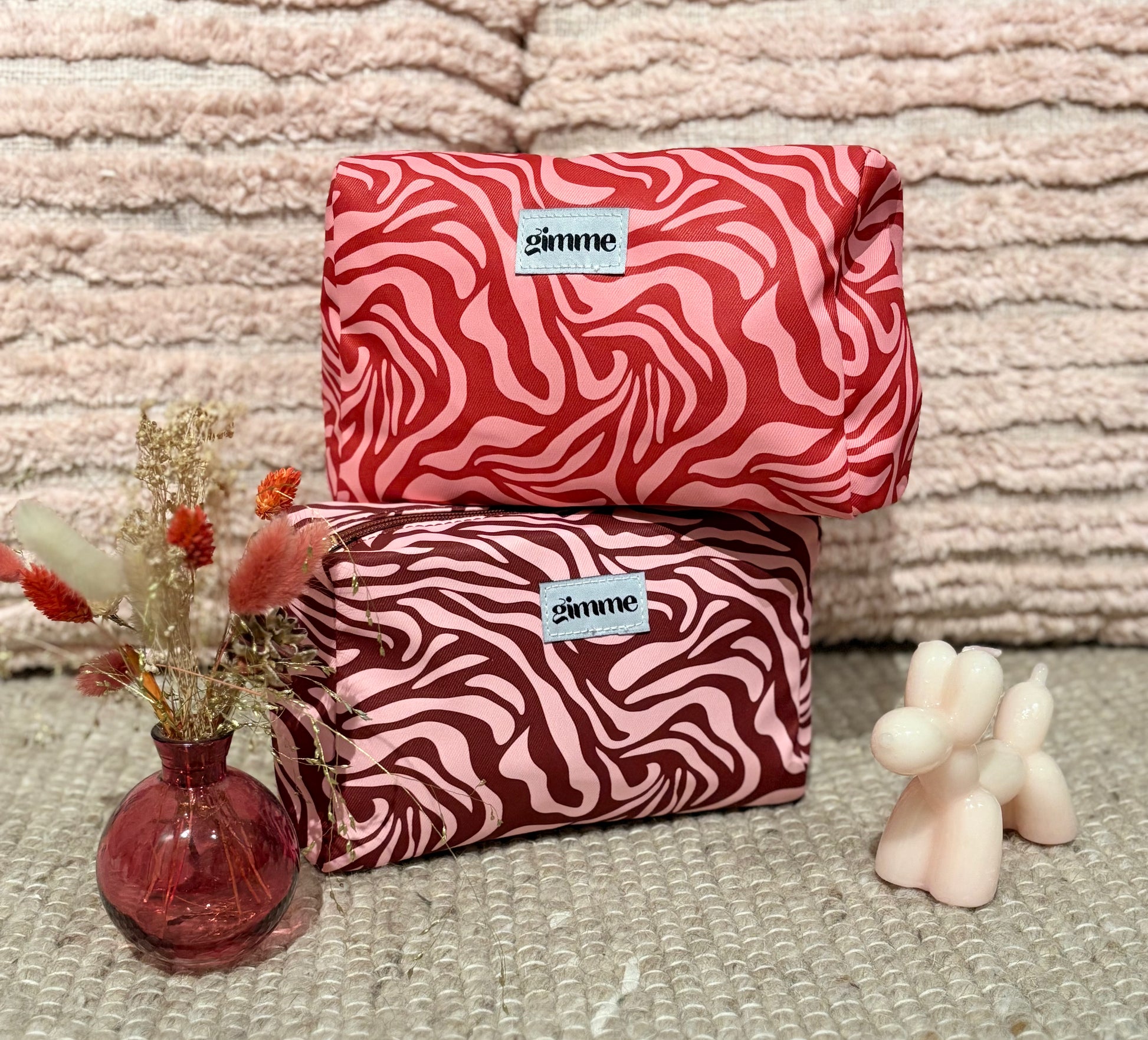 Organisez vos essentiels de beauté avec cette trousse de toilette aux teintes rose et rouge, alliant style et fonctionnalité.